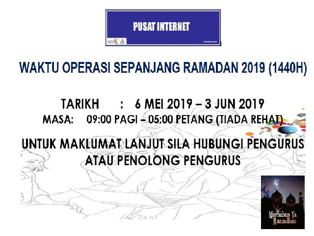 Berikut adalah Notis Waktu Operasi Pusat Internet Pekan Kubu Gajah pada bulan Ramadhan bermula 6 Mei - 3 Jun 2019